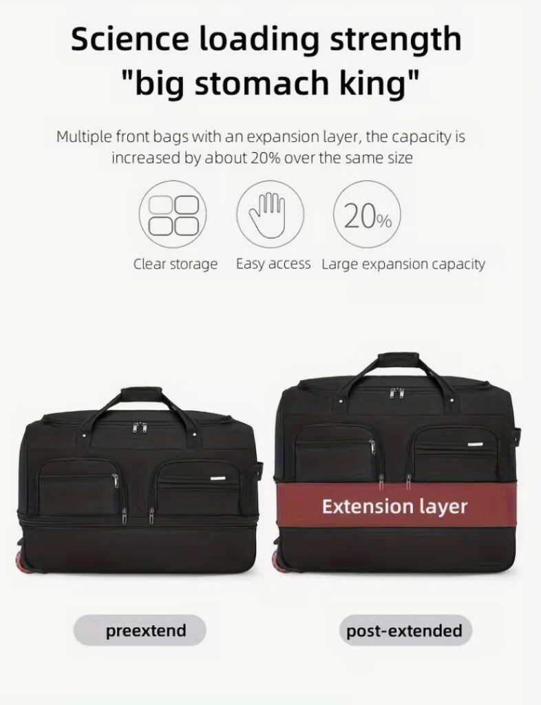 Meet the Wutisss Global Large Expandable Wheeled Travel Duffel Bag, the perfect travel companion designed for people who need space, durability and effortless mobility.
